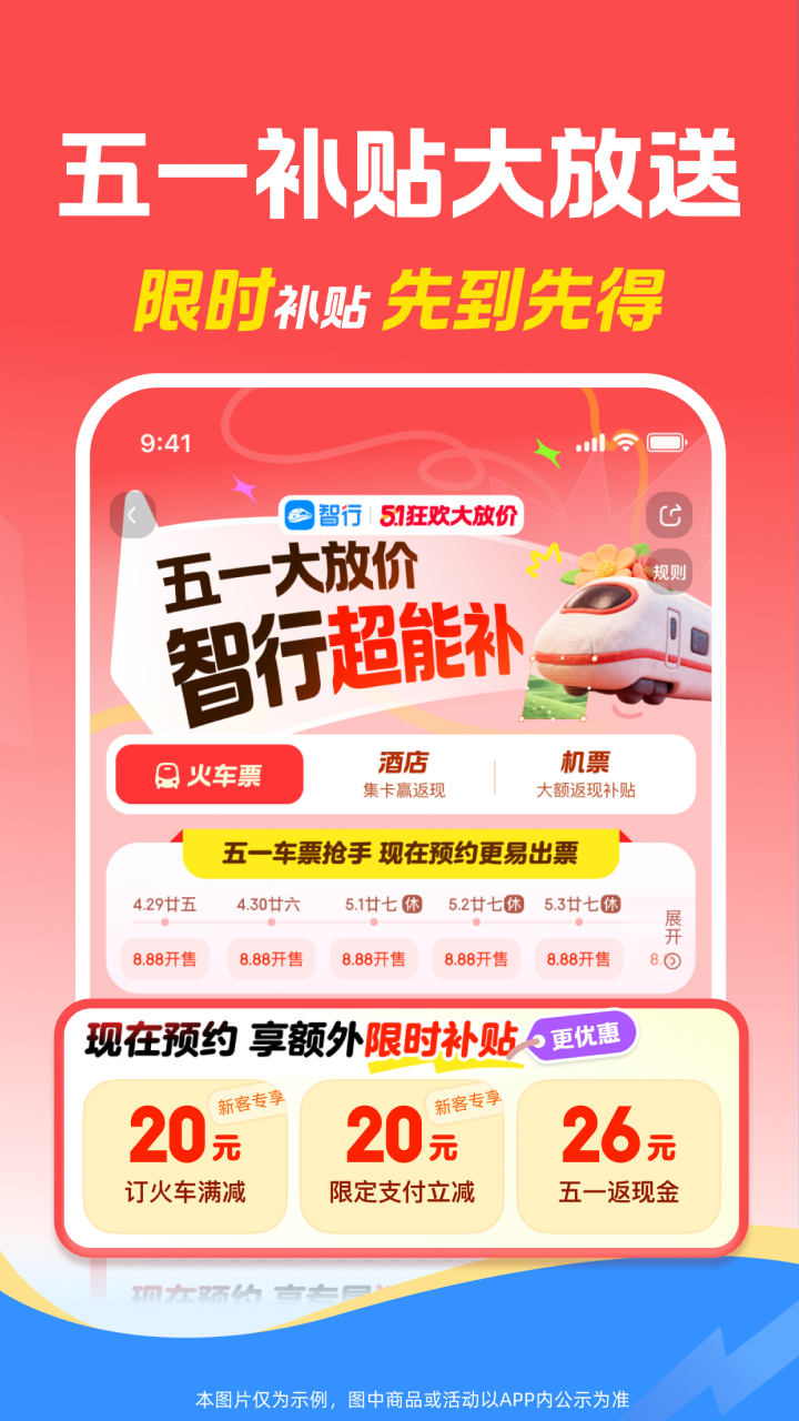 智行火车票-火车票、机票、酒店、汽车票、门票、船票一站式出行预订平台。 火车出行专家,提供火车开售时间、正晚点、候补改签等一站式出行服务,功能全面助您旅途顺心! 主要产品与服务: 【火车票】 [专业抢票] - 提前预约下单,开售时立即出票;候补有保障,还能抢余票。 [24小时抢] - 可全天24小时抢票,有专人监控出票,专属抢票保障,抢不到就敢赔。 [抢票福利] - 靠窗、下铺免费抢,... 展开